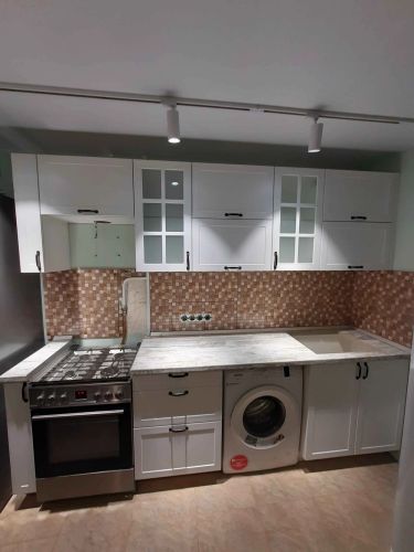 Соберём каркасы, навесим шкафы, дверцы и фурнитуру. Всё отрегулируем. Установим, мойку с сифоном и смесителем.